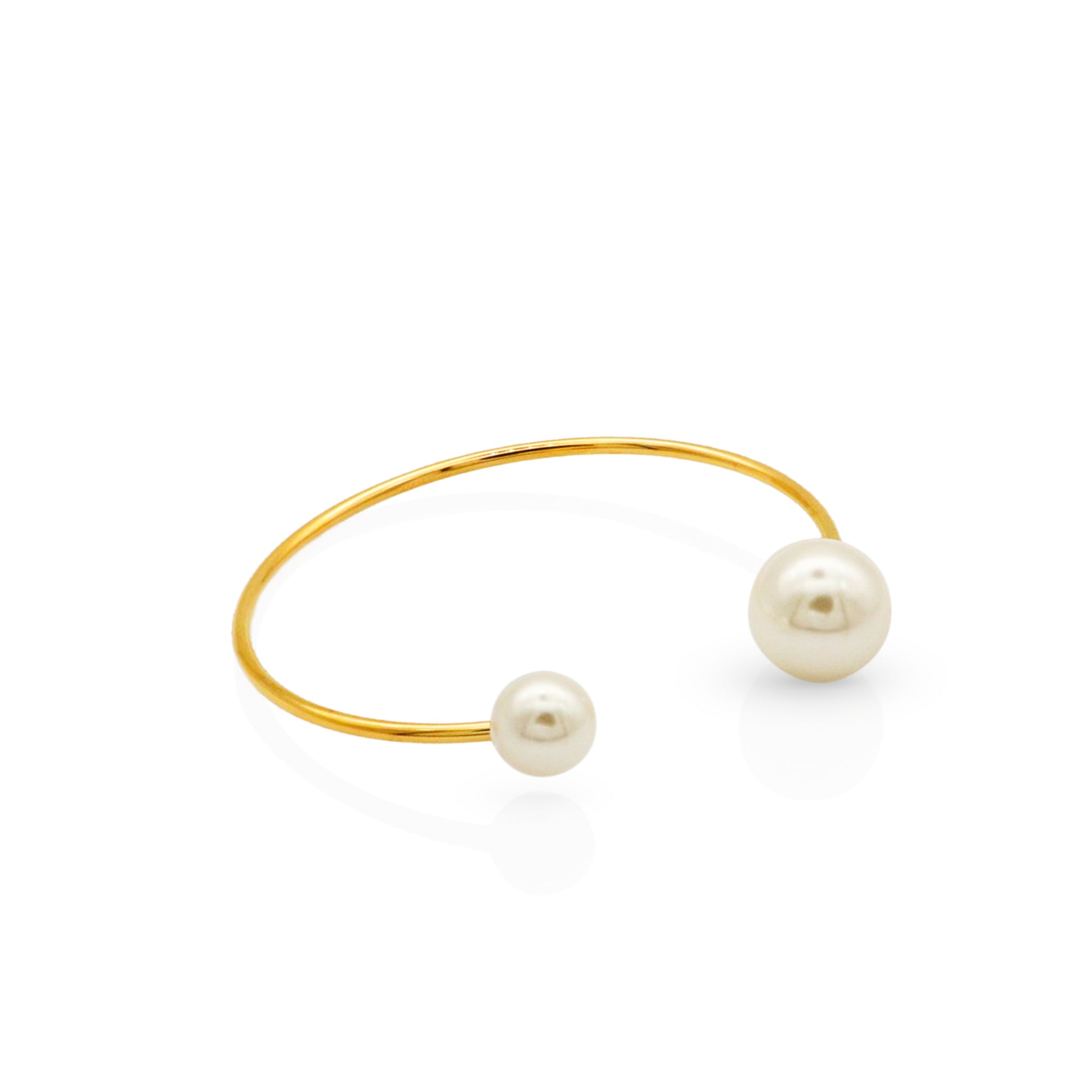 Elevate your style with this daring 18k gold plated bangle featuring two striking pearls in contrasting sizes. The bold combination of a larger and smaller pearl creates a captivating balance, making this bracelet a statement piece that effortlessly enhances any look. Perfect for those who embrace elegance with an edge.