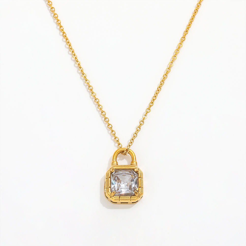 A geometric square lock pendant featuring brilliant cubic zirconia that sparkles with every movement. This sleek necklace brings contemporary style and understated sophistication to your everyday collection.
